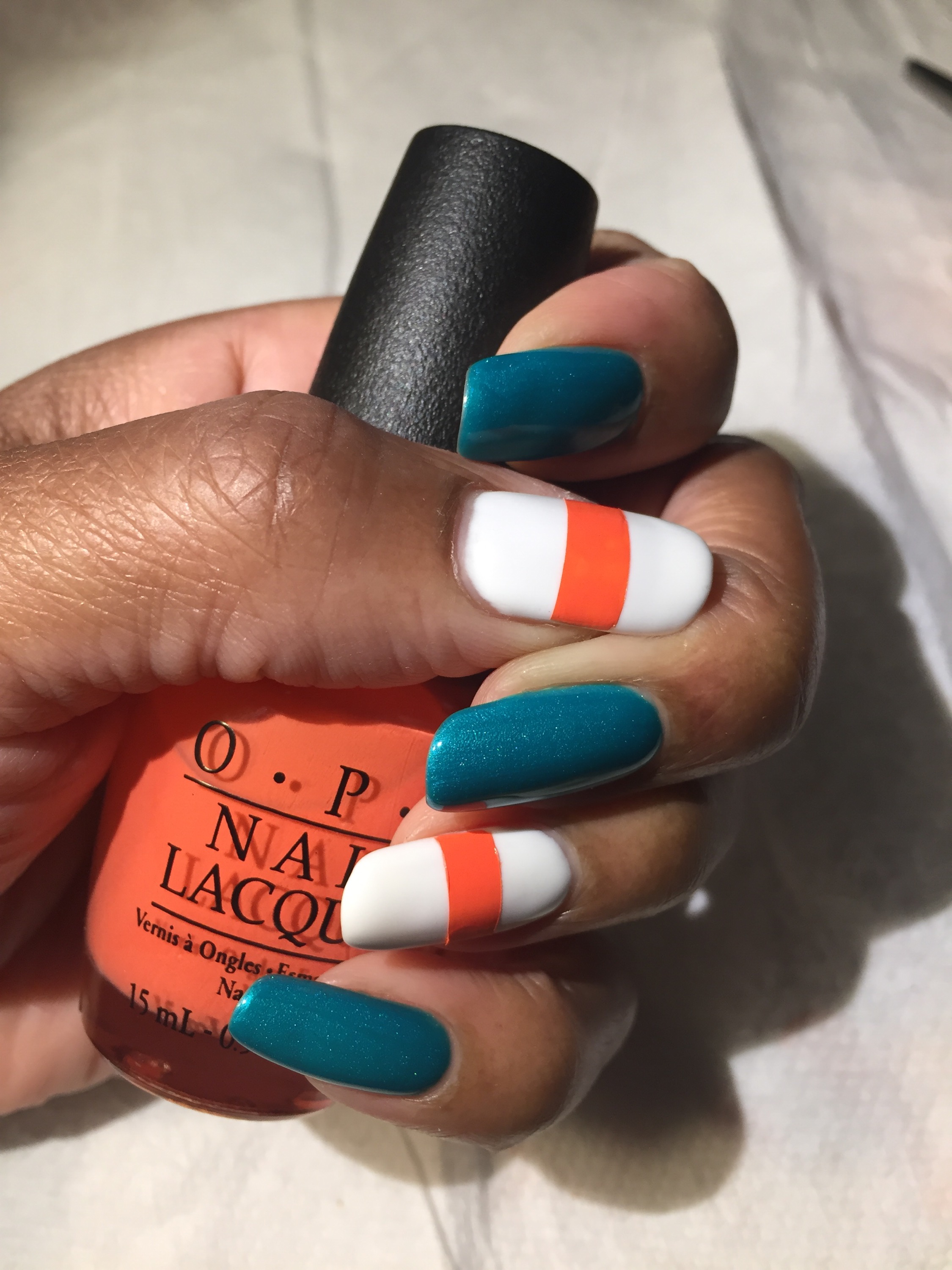 I did a white no-chip manicure under this nail design, and a no-chip top coat on top of the strips…for longer wear, of course.  And shorter “dry” time.