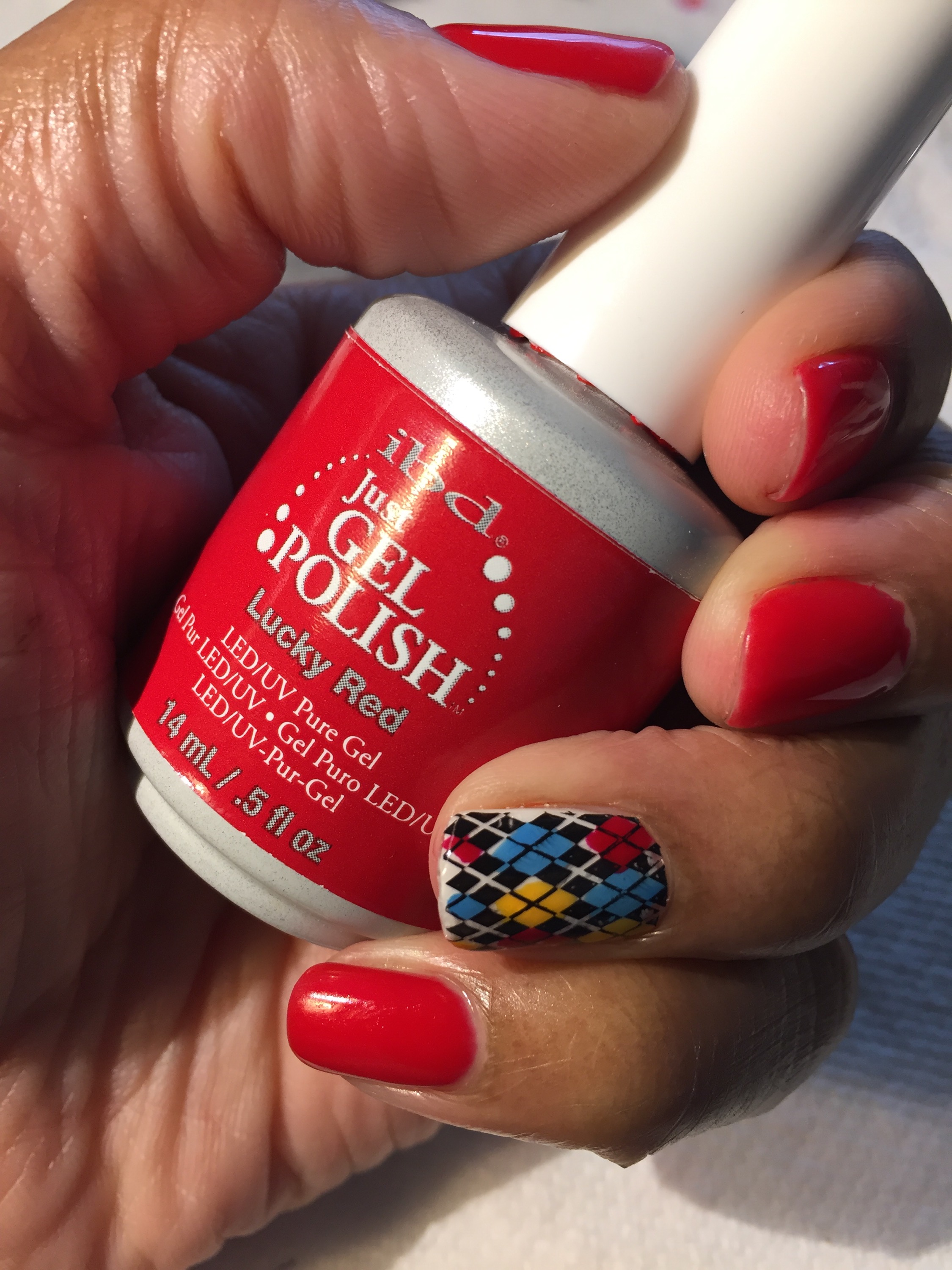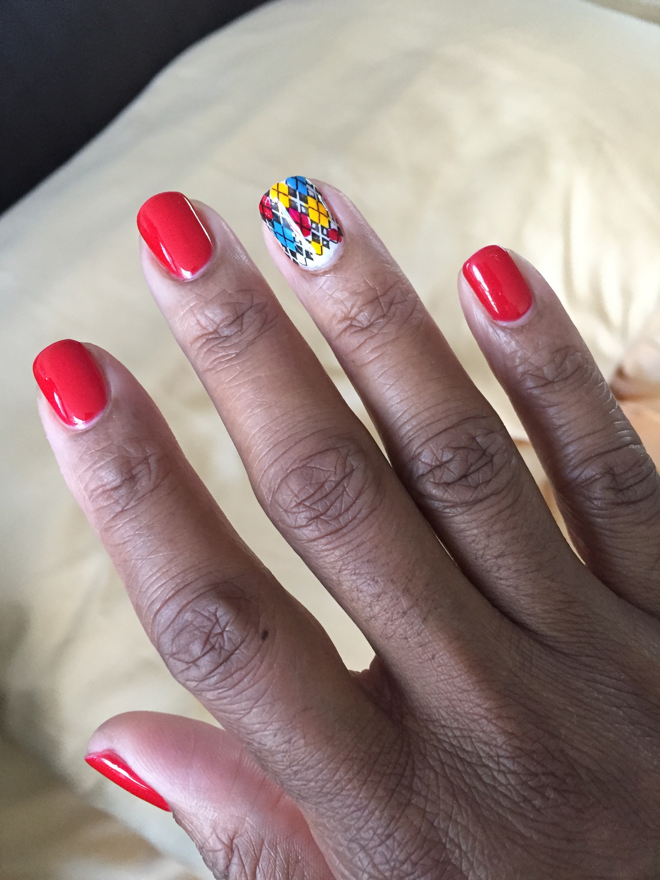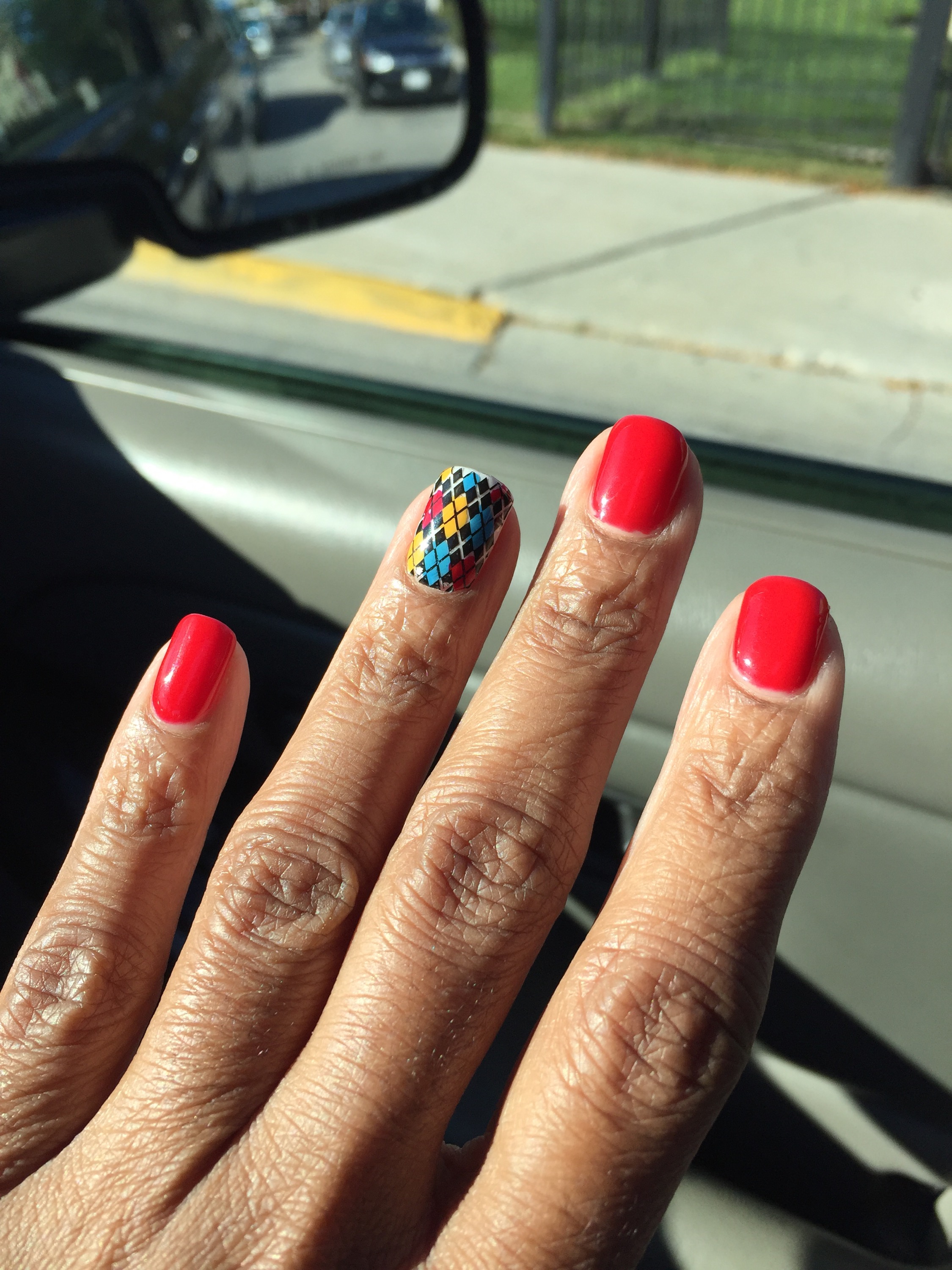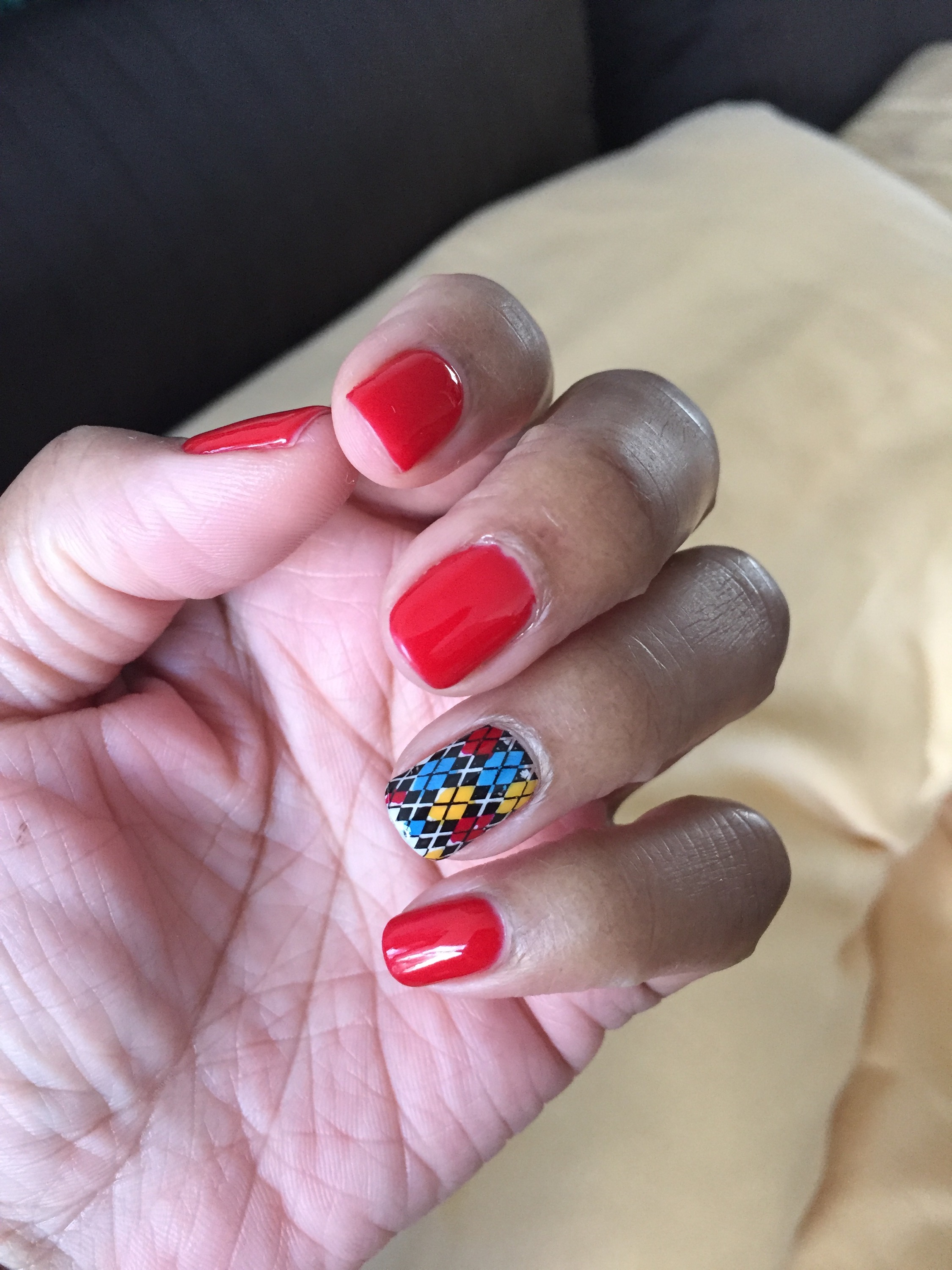 I created a decal for my ring finger design with a stamp design and added color. Primary colors. Applied over a base of a white no-chip polish.