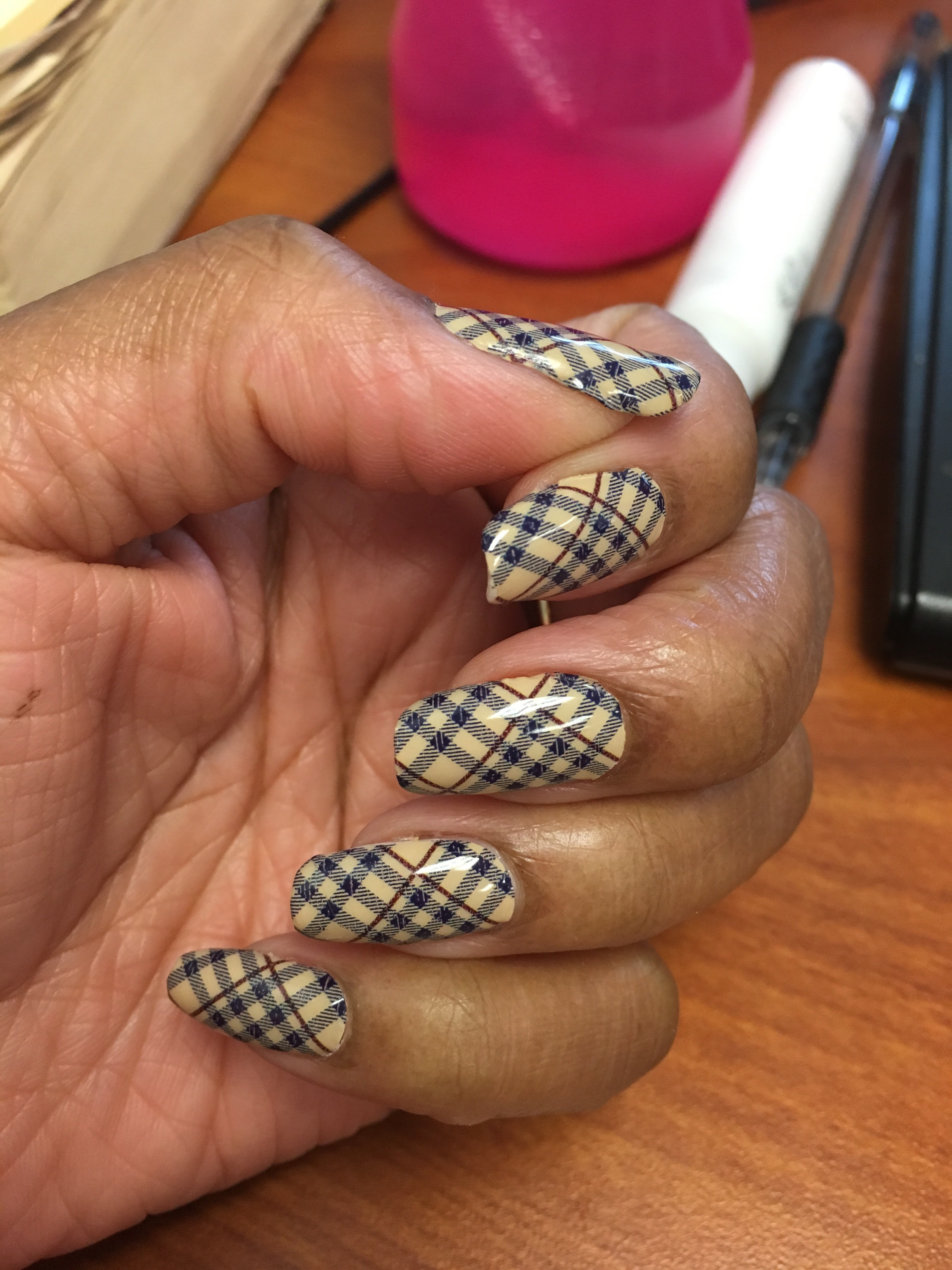 To create the same long lasting designs as my hand-painted creations, I used a white no-chip polish, then top coat. Then I applied the polish strips (per the directions on the box. – basically peel and stick. haha). Applied another coat of top coat…cured…. and voilà!! Cute plaid nails for me.