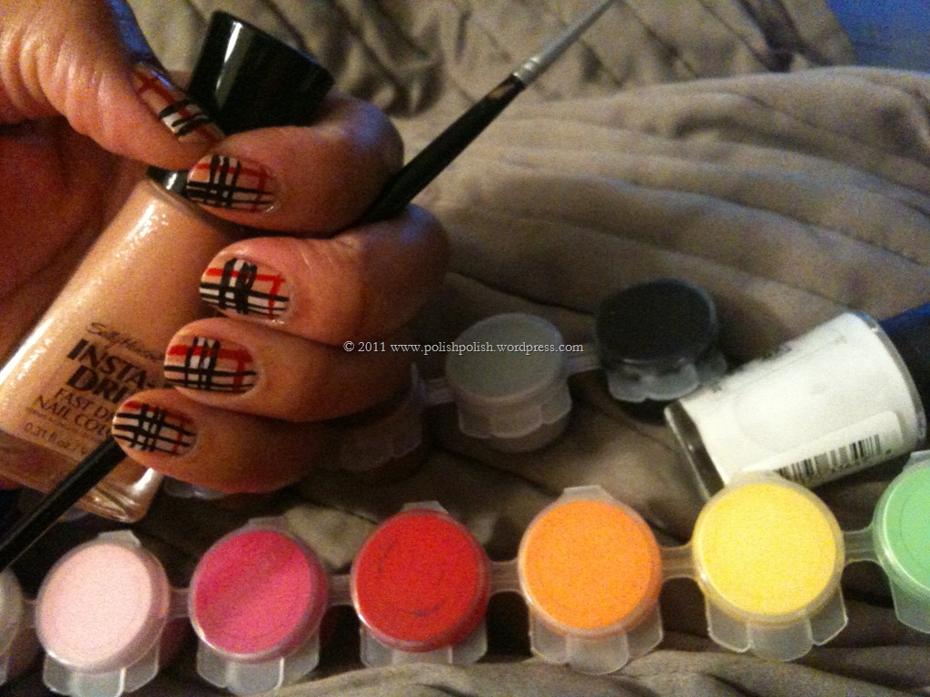 Then I added some white stripes with white nail polish; tried some free-hand black and red stripes with acrylic paint…. top coat….. and "almost" Burberry :-).