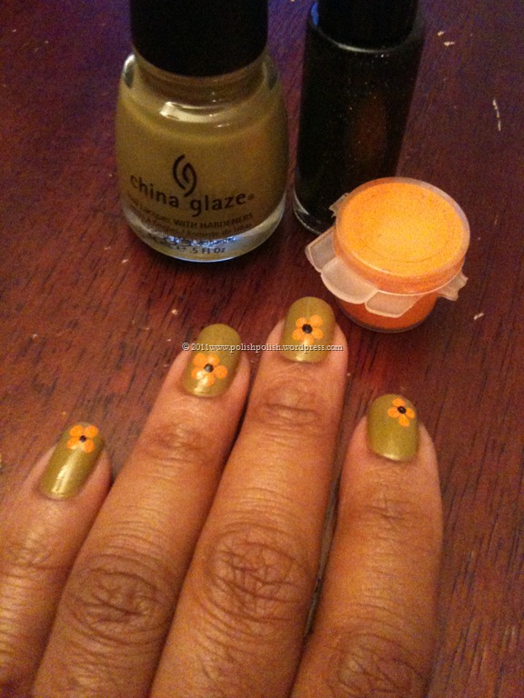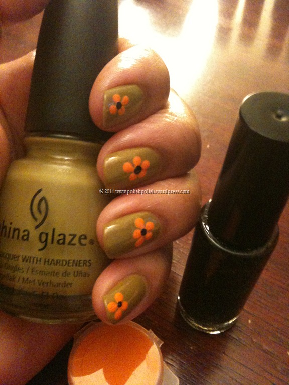 The little flower seems like the highlight, but this China Glaze color, in all it’s drab undertone, has a BEAUTIFUL shimmer. Little eensy weensy, tiny flecks of gold meandering all through the liquid.