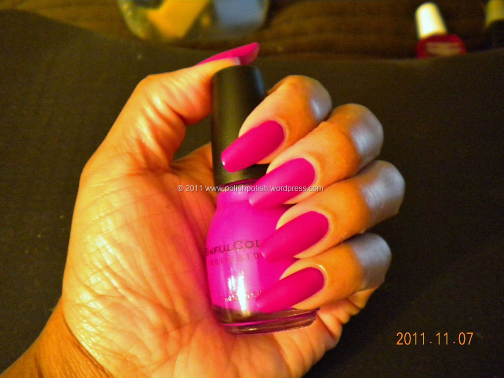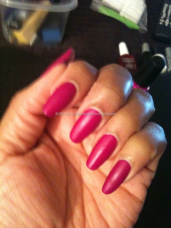 There are definite advantages to this matte polish. It dries very quickly. This one has decent opacity. But I still find it challenging. The polish easily swipes “off” while you’re polishing. That’s all bad. I managed through the application though. *sidenote: I AM giving this polish away immediately. I don’t want to use it again. I have to find another fuchsia.