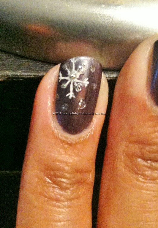 I ended up with a sort of in-between snowflake from the two… and I could only withstand the painstaking task on the fingernails of my ring fingers…. this nail art is work!