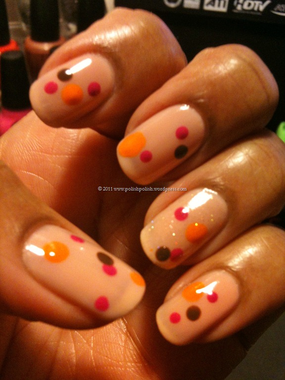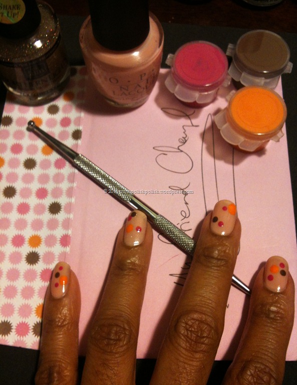 The base color is OPI - “Malaysian Mist”… dark pink, brown and orange acrylic paint applied with a dotting tool.