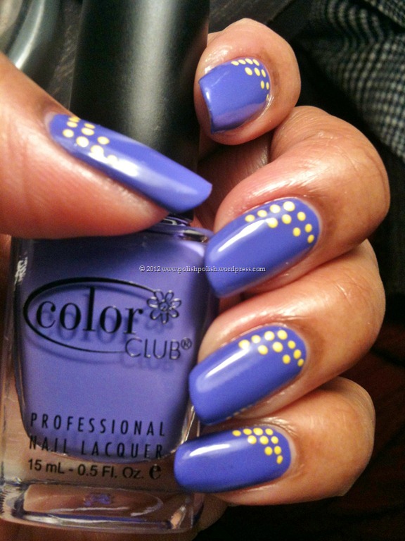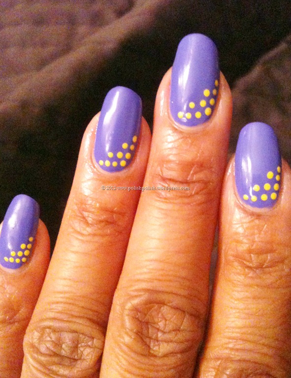 Smooth pretty creamy luscious purple.  Set off by little yellow dots….my favorite.  Soon I will have to do a “polka dot month” of manicures.  I’m certain of it.