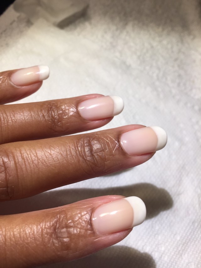 I did a white no-chip manicure under this nail design, and a no-chip top coat on top of the strips…for longer wear, of course. And shorter “dry” time.