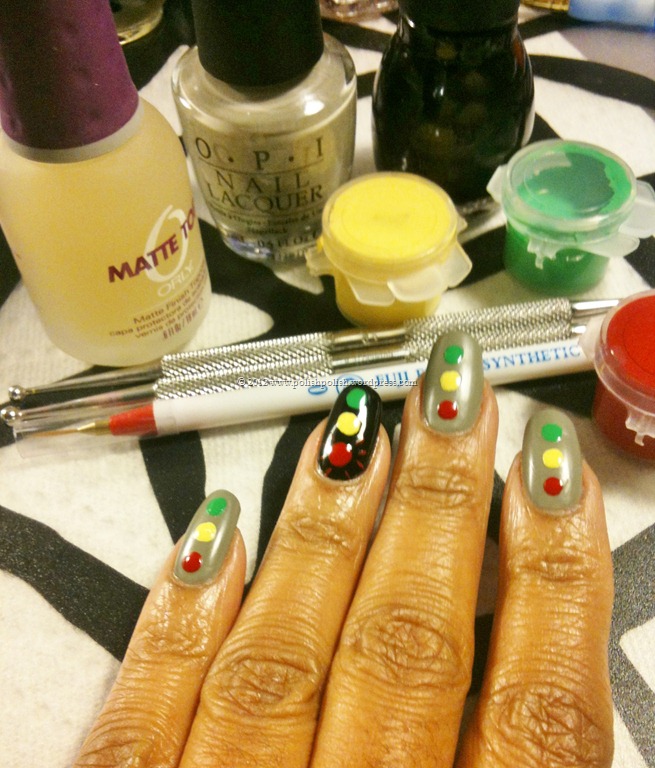 Now that my nails are short- I mean, short, short- they are so much FUN! So much fun to change – frequently. Playing around with my new acrylic paint and dotting tool, I came up with: