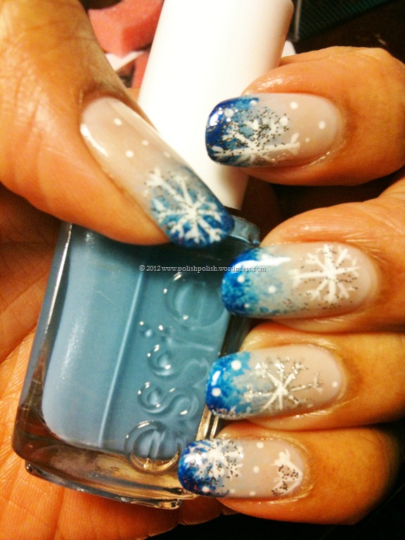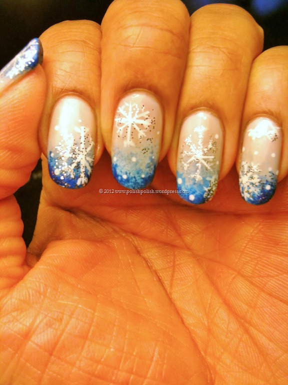 I used a white nail art striper (and a silver glitter one to add to one snowflake on my ring fingernail) to create my snowflakes.  White polish with a tiny dotting tool for random dots of snow falling, and  Sinful Colors “Queen of Beauty” for some shimmer over the snowflakes.