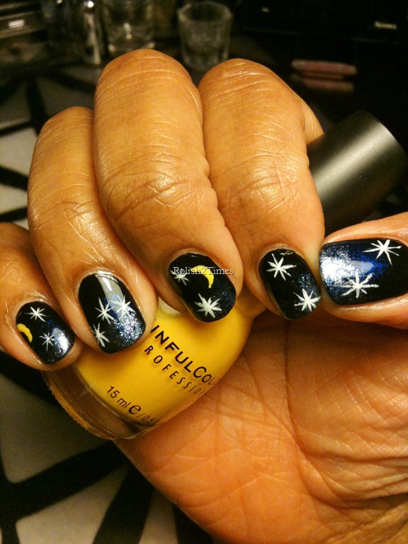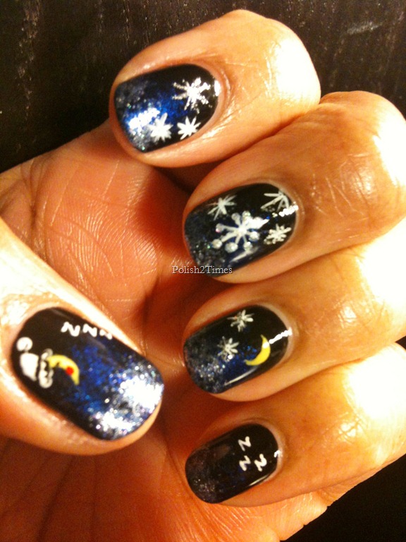 IMG_2796The base color is black, then I sponged on the midnight blue from the middle to the tip of the nail, and then sponged the silver on the tips…. After that, I added the crescent moons, stars and a couple of “zzz’s”…