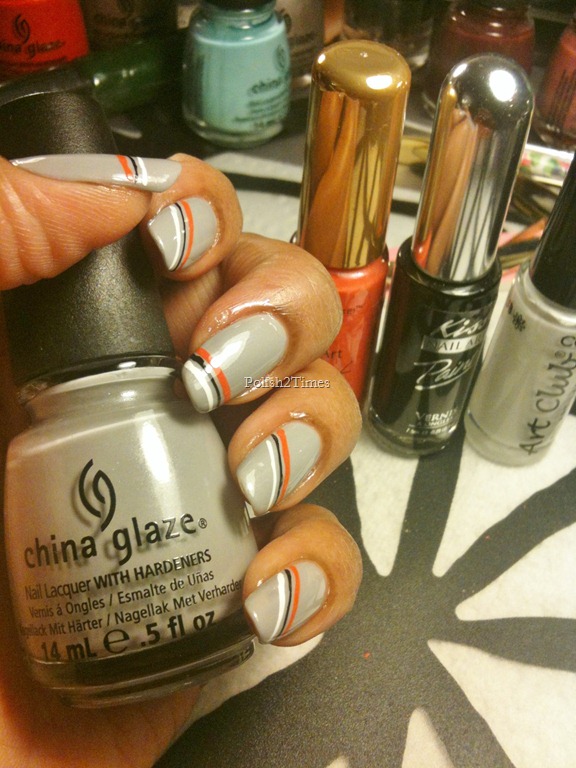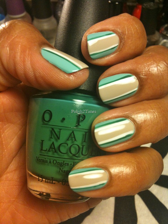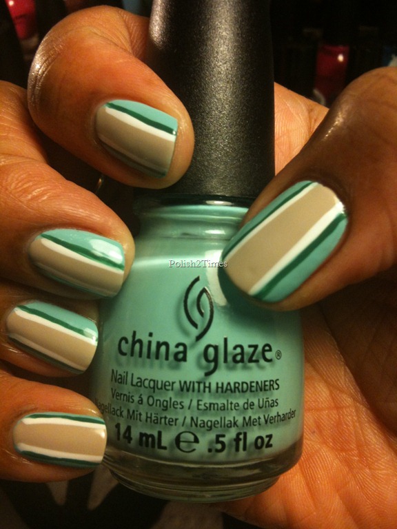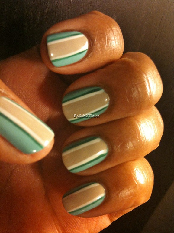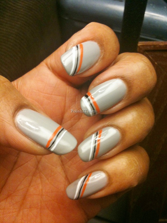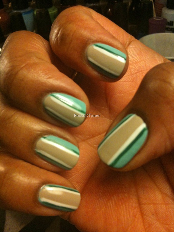 I saw a striped design mani on my bloglovin’ feed today… BUT I CAN’T FIND THE MANI I’M COPYING!!!!!! Hers was incredible. She had horizontal stripes on all but an accent nail. And her lines were nice. I’m still practicing. LOL. So, I did more diagonal lines than horizontal.